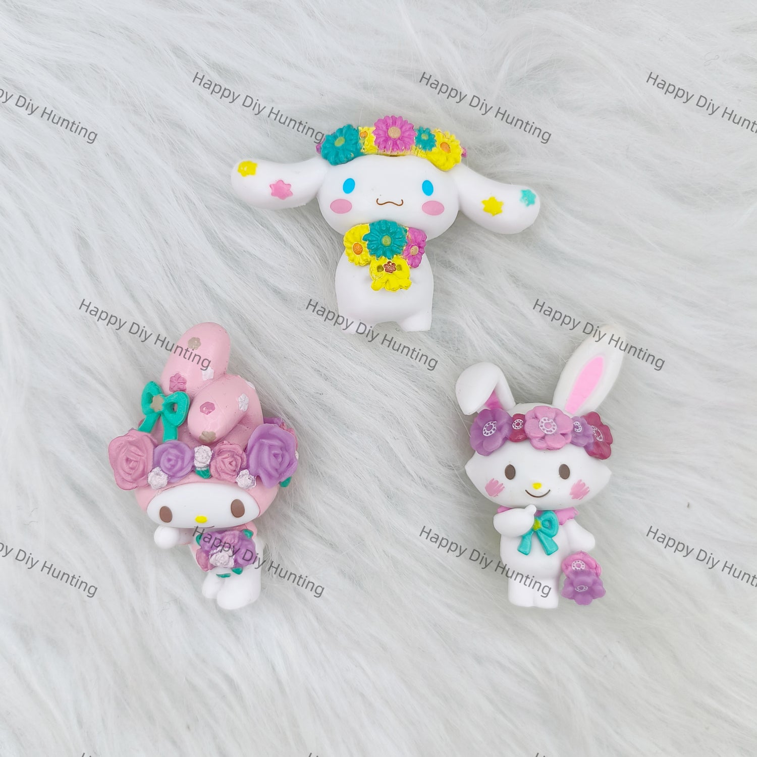 These are enchanting pen caps featuring beloved Sanrio characters adorned with beautiful floral decorations. There’s Kuromi in a purple outfit with a floral party hat, holding a pink flower; Pochacco wearing a purple shirt, a floral crown, and a cute yellow bird on its head; a lovely bunny with a floral headband and a green bow; Cinnamoroll with a colorful floral crown and star details on its ears; and My Melody in a pink floral hat, surrounded by purple roses. Each pen cap is meticulously crafted with vibrant colors and delicate floral details, perfectly capturing the cute and whimsical essence of these characters. They are not only practical accessories for your pens but also bring a touch of floral fairy-tale charm to your stationery, making every writing moment feel like a stroll through a blooming garden.