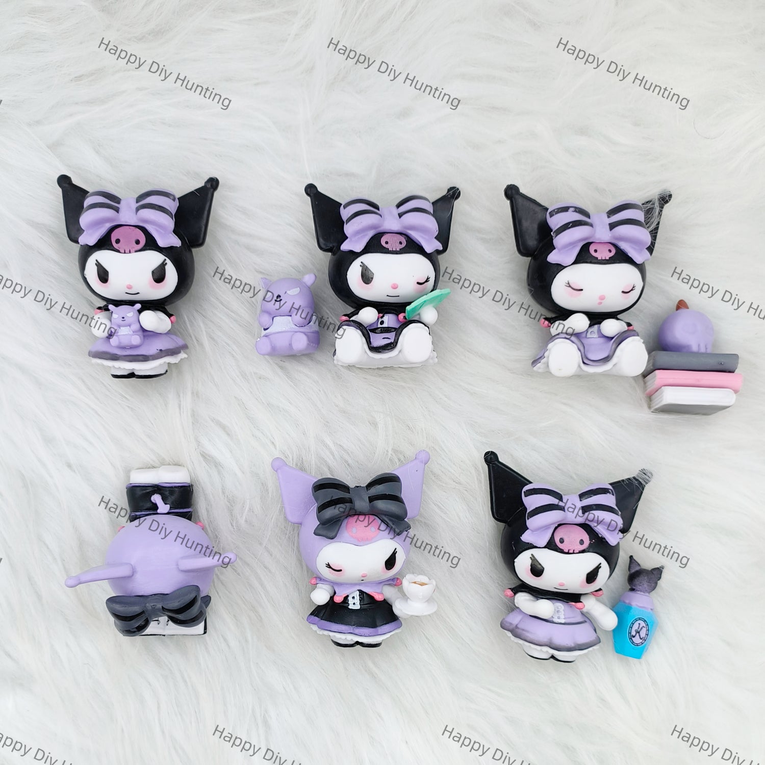 These are six charming pen caps featuring Kuromi, a popular Sanrio character. Each Kuromi is in a unique pose and comes with cute accessories. One is beside a stack of books with a skull-shaped object, another is reading a book, and another is with a small purple creature. There’s also Kuromi holding a teacup, standing next to a potion bottle, and holding a tiny plush toy. With her signature purple and black color scheme, skull emblem, and adorable expressions, these pen caps are not only practical for protecting your pens but also wonderful collectibles that bring a touch of whimsical charm to your stationery collection.
